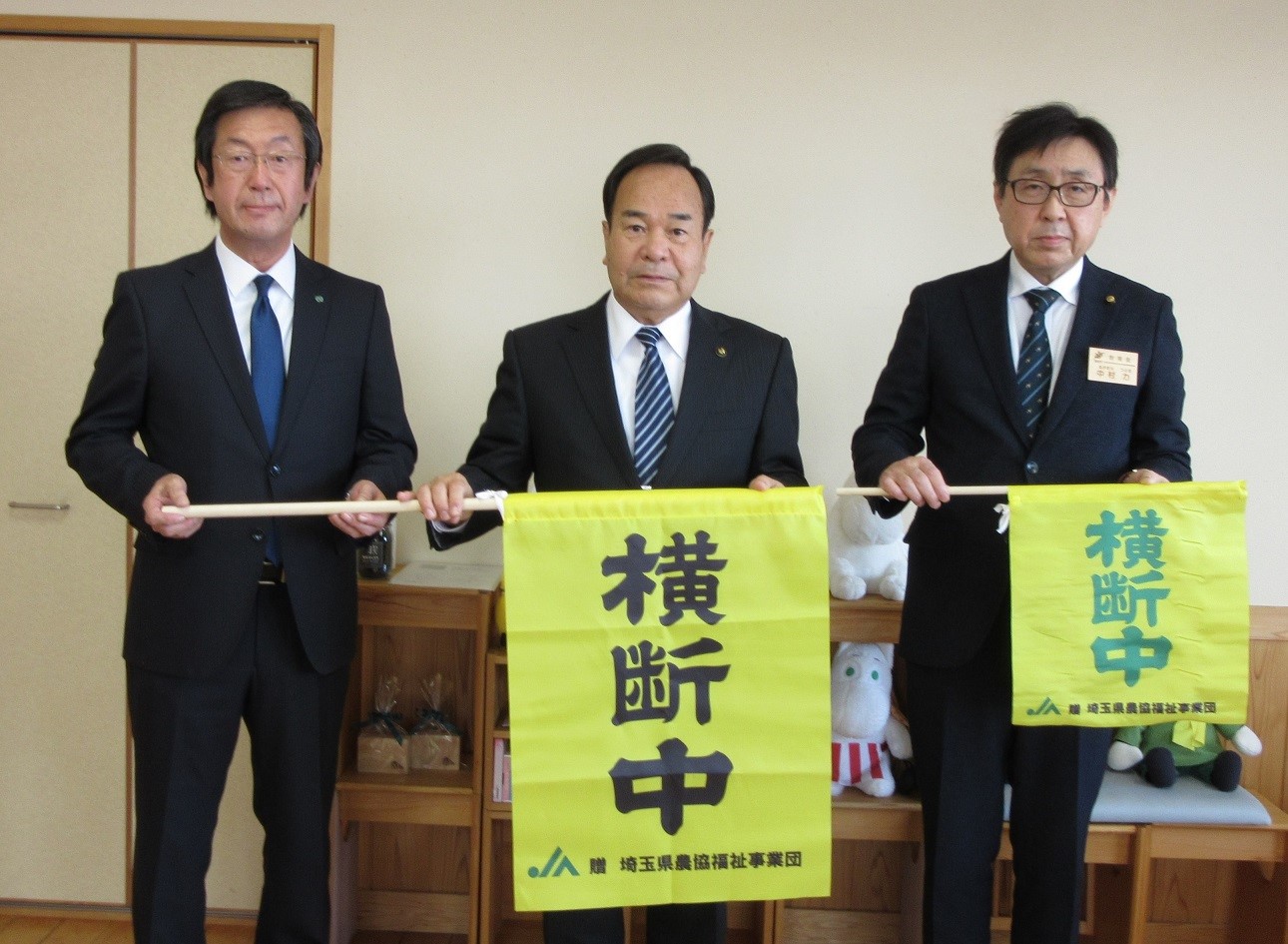 いるま野農業協同組合から地域交通安全のため、児童用と保護者用の横断旗を寄贈いただきました。