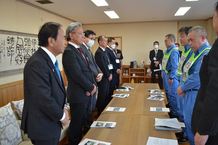 2月28日(水曜日)、令和6年能登半島地震に係る被災者支援のため、2月23日(金曜日・祝日)~28日(水曜日)までの6日間、石川県輪島市にて応急給水業務にあたっていた本市上下水道部職員4名の派遣が無事終了し、現地での活動報告を受けました。