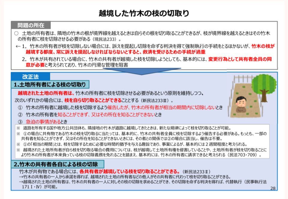 隣接する土地の管理不備に起因する越境物等により被害を受けられている場合、その対応については、民法(相隣関係の規定)に基づき進めることが原則となります。特に、令和5年4月1日施行の民法改正により、「竹木の枝の切除」に関するルールが見直されています。