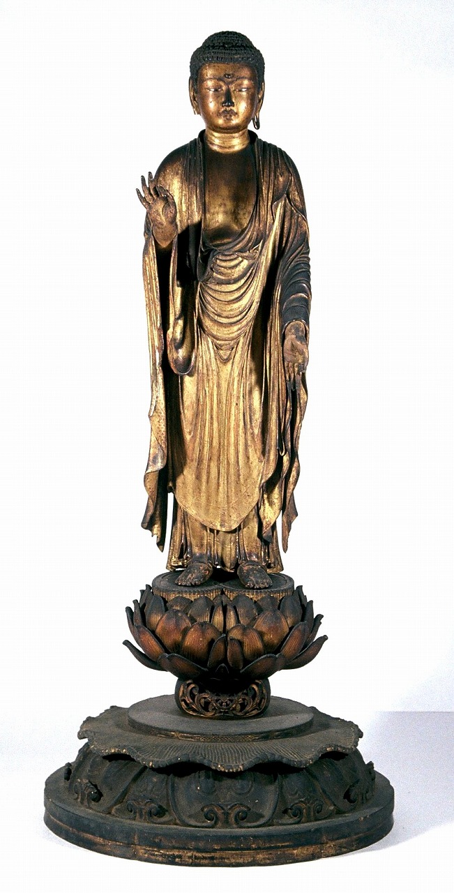 像高51.3センチメートル、檜材寄木造、玉眼、表面は錆下地・黒漆塗りに白土・丹・金泥を重ね、着衣部に種々の截金文(きりがねもん)を施しています。右手を胸の前に上げ、左手を垂下し、ともに第一指と第二指を捻じて掌を前に出し、踏割の五重蓮華座の上に立っています。